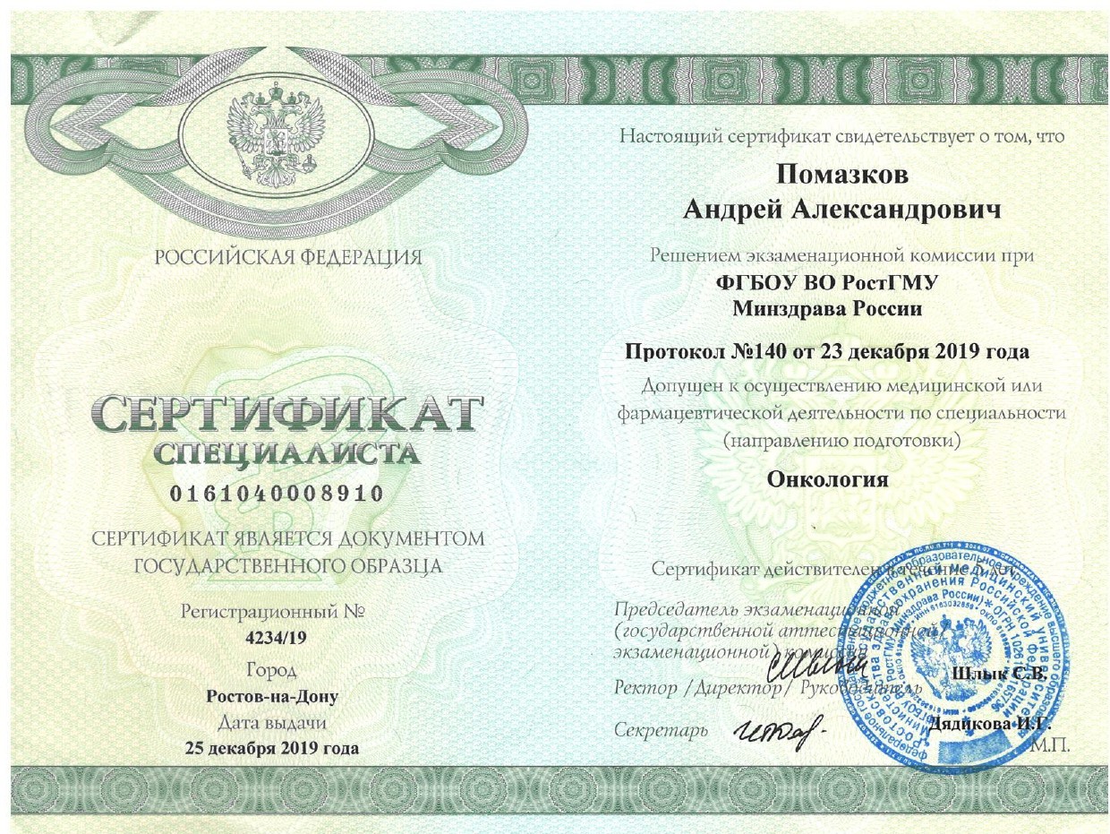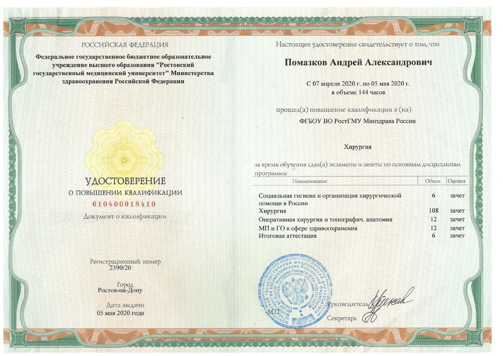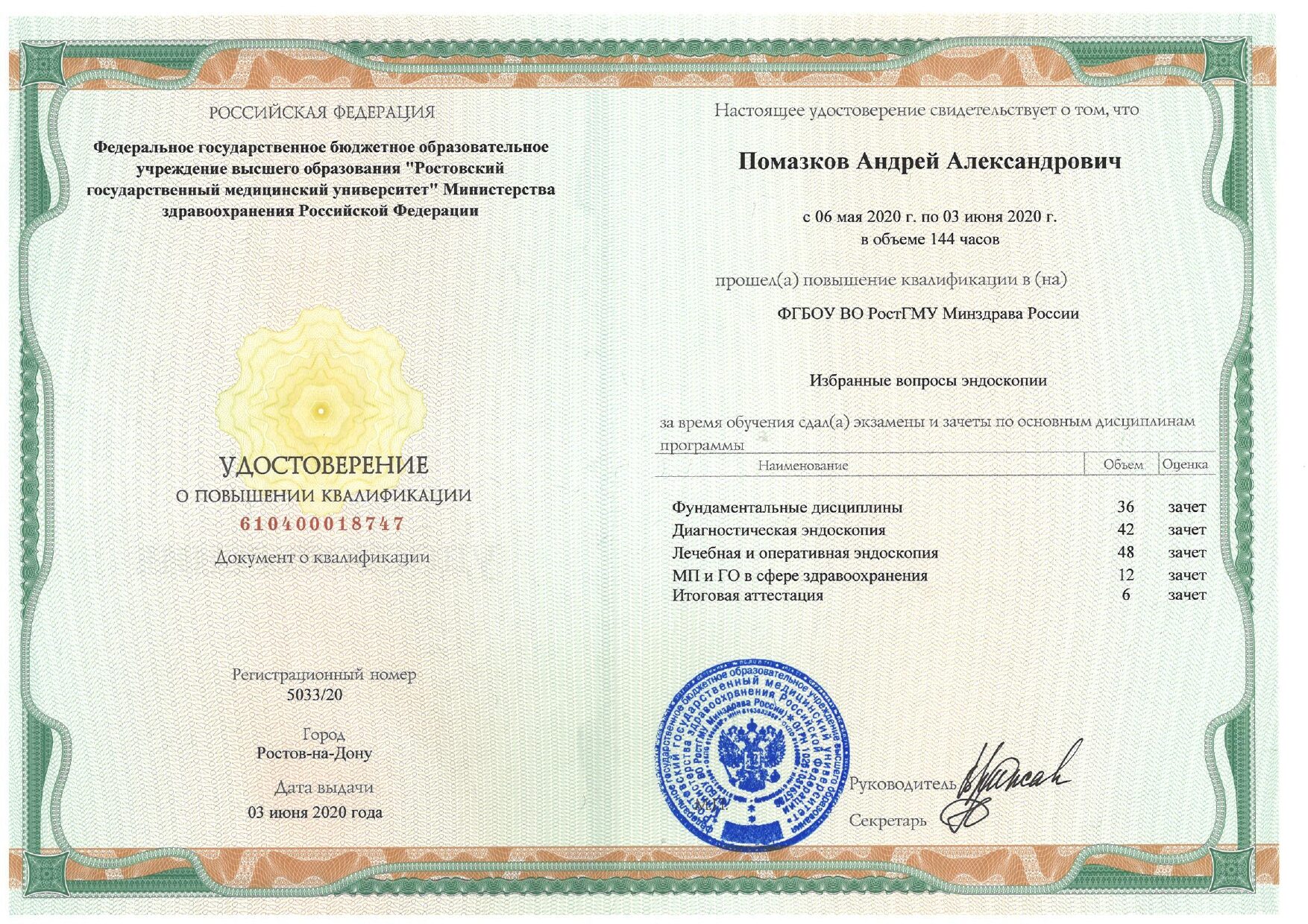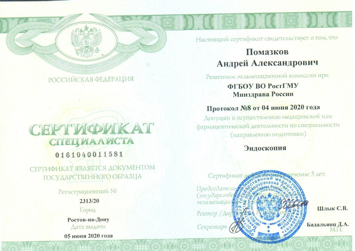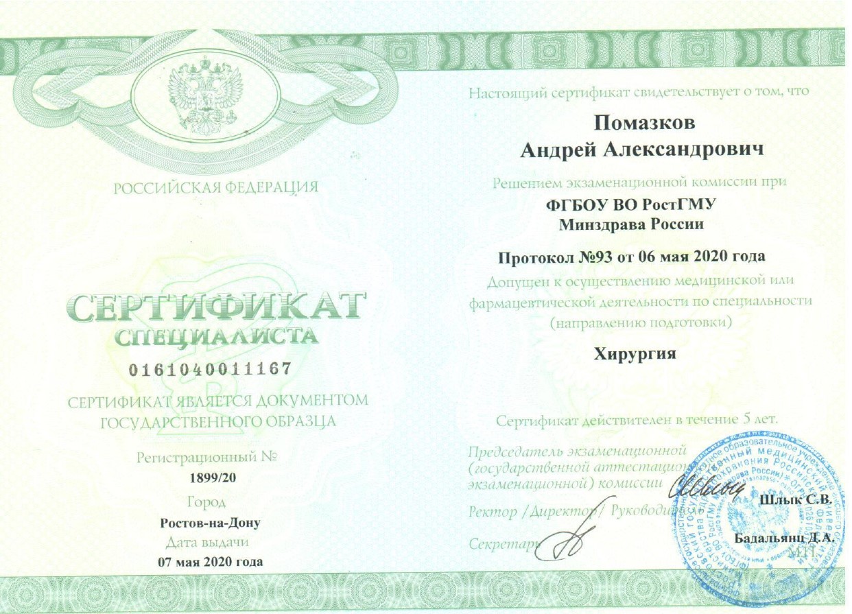 2020 г. Сертификат специалиста от 07.05.2020г. по 07.05.2025.г ФГБОУ ВО Рост ГМУ Минздрава России