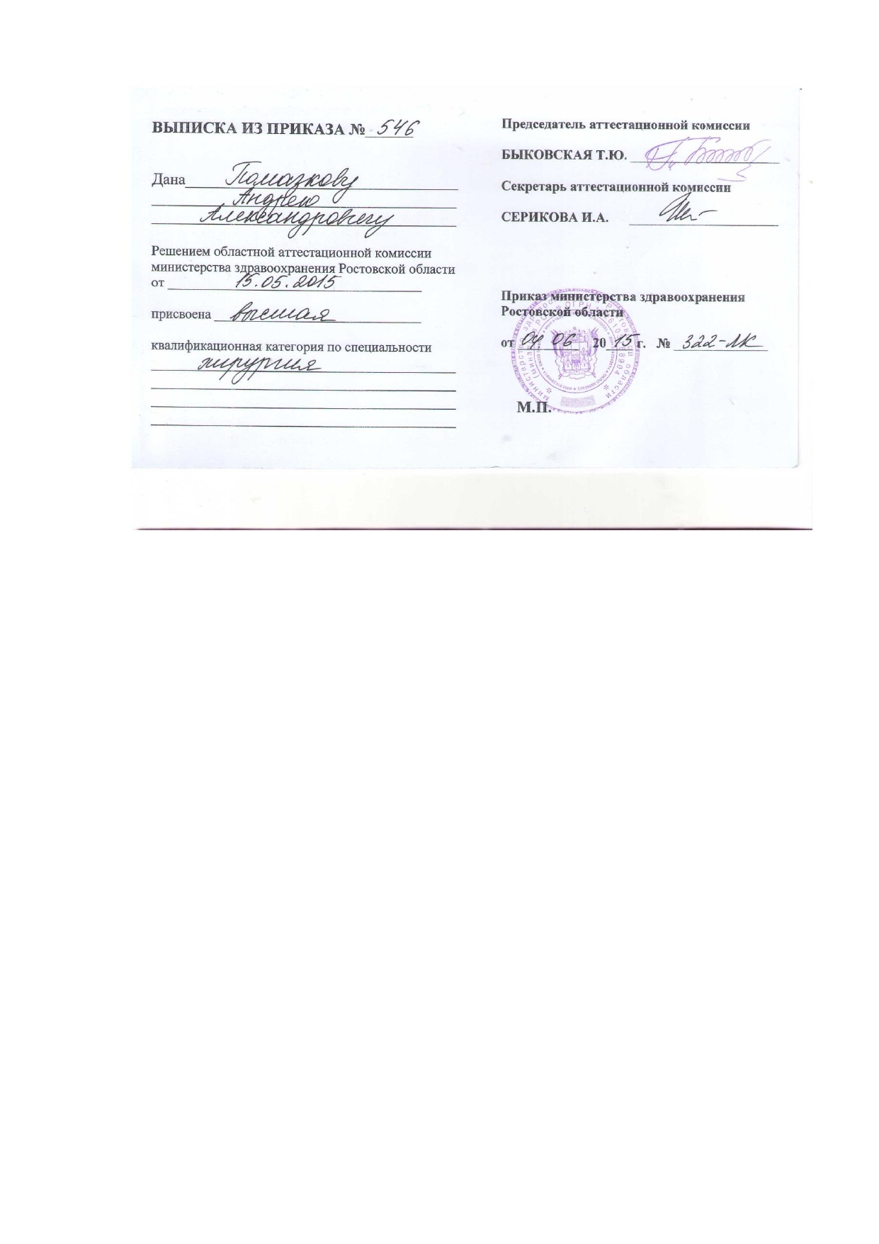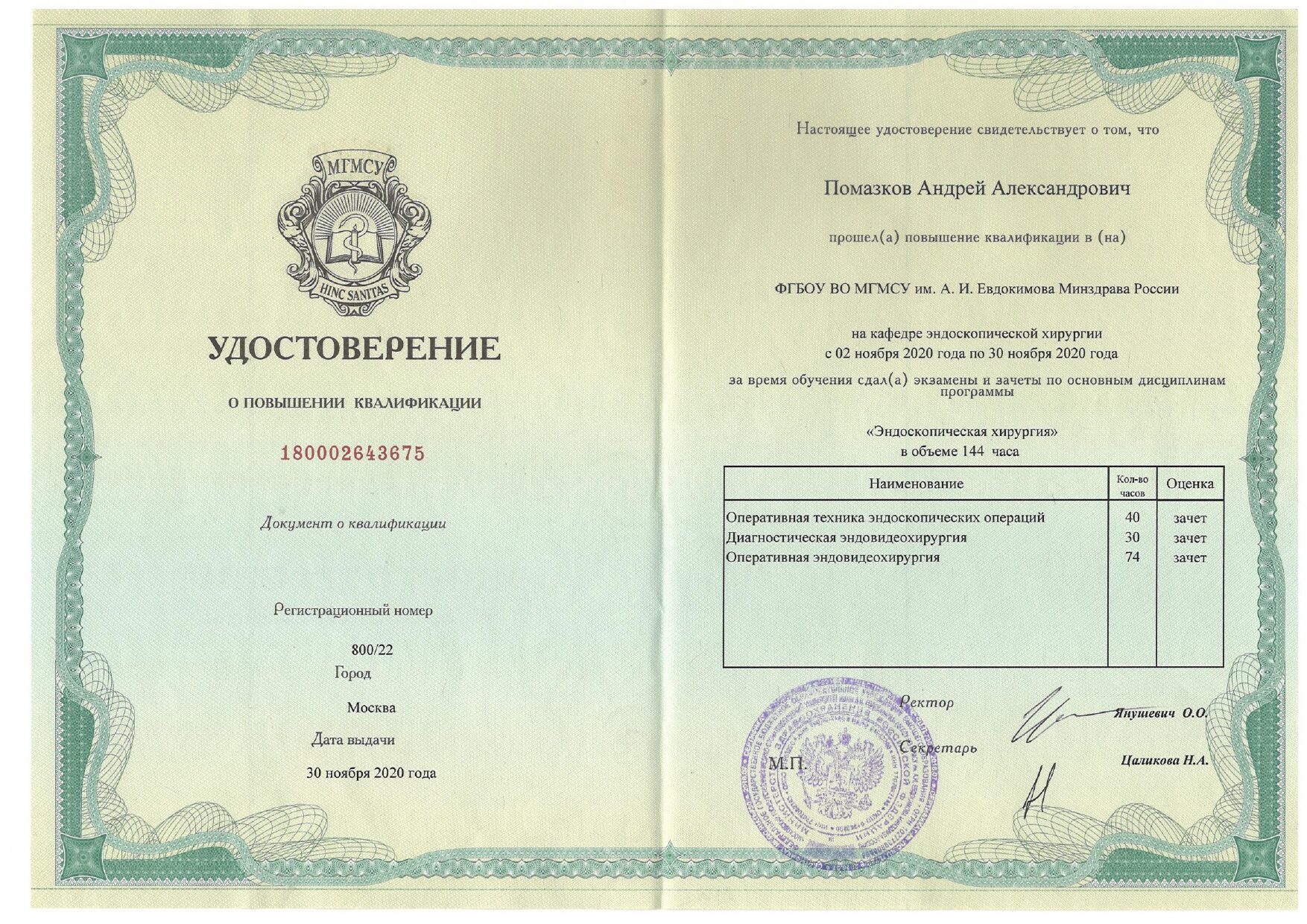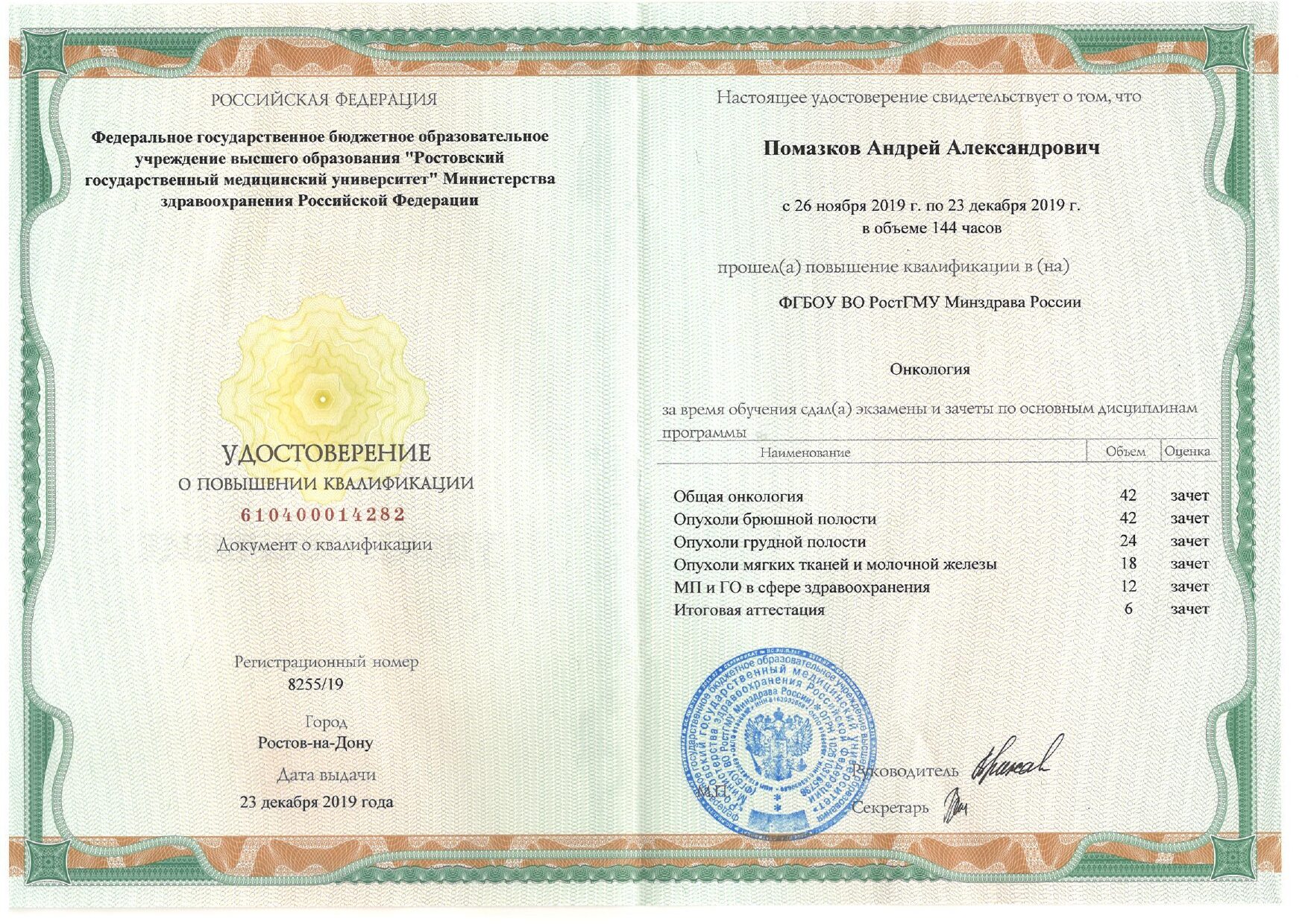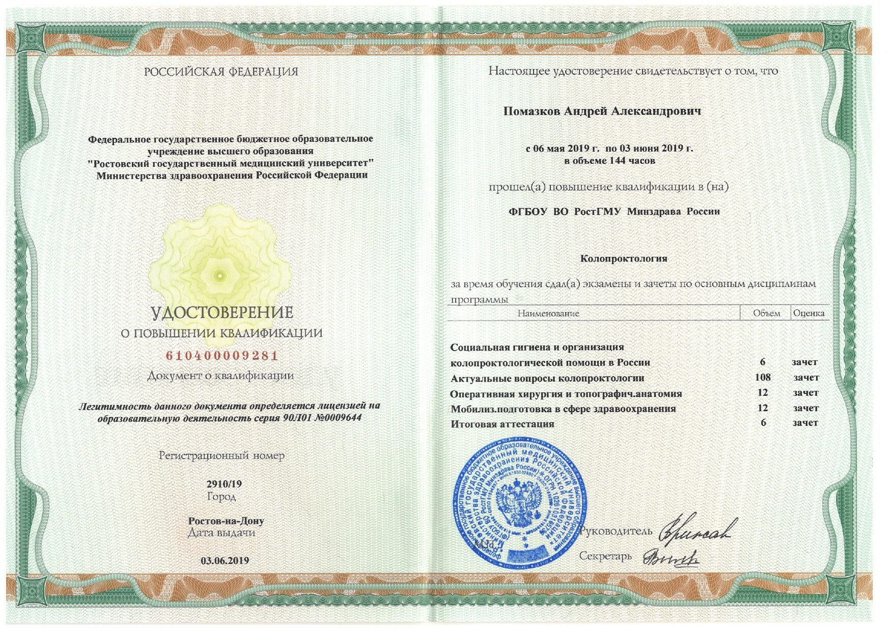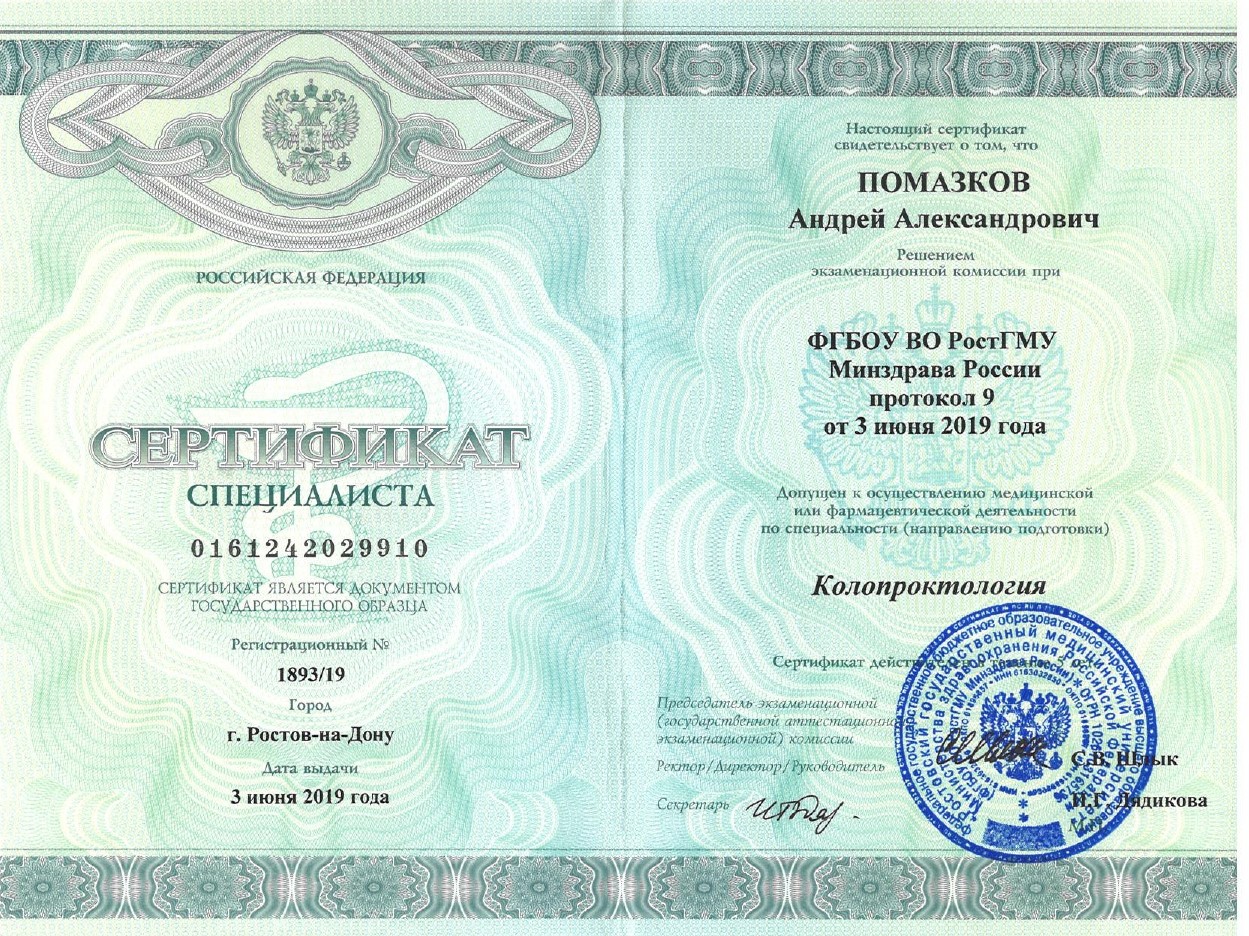 2020 г. Сертификат специалиста от 07.05.2020г. по 07.05.2025.г ФГБОУ ВО Рост ГМУ Минздрава России