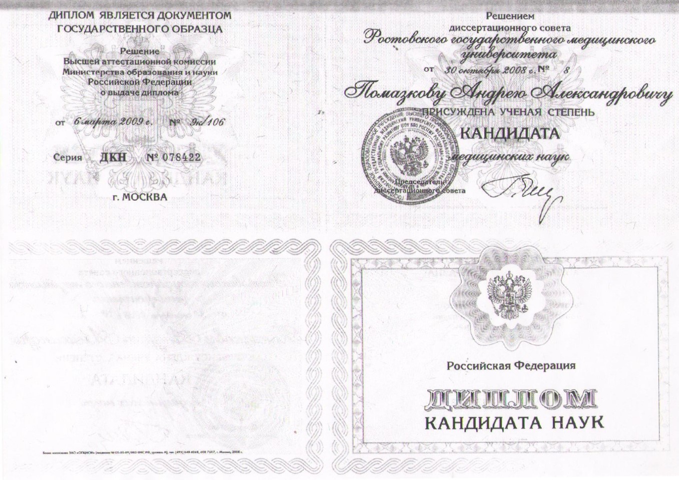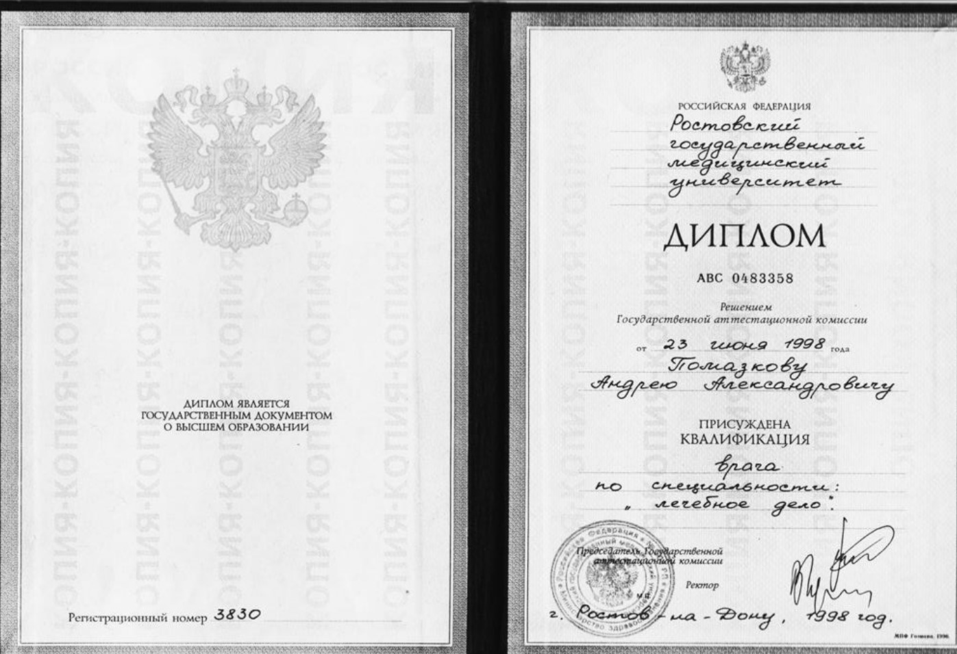 1998 г. Диплом РГМУ в г. Ростов-на-Дону