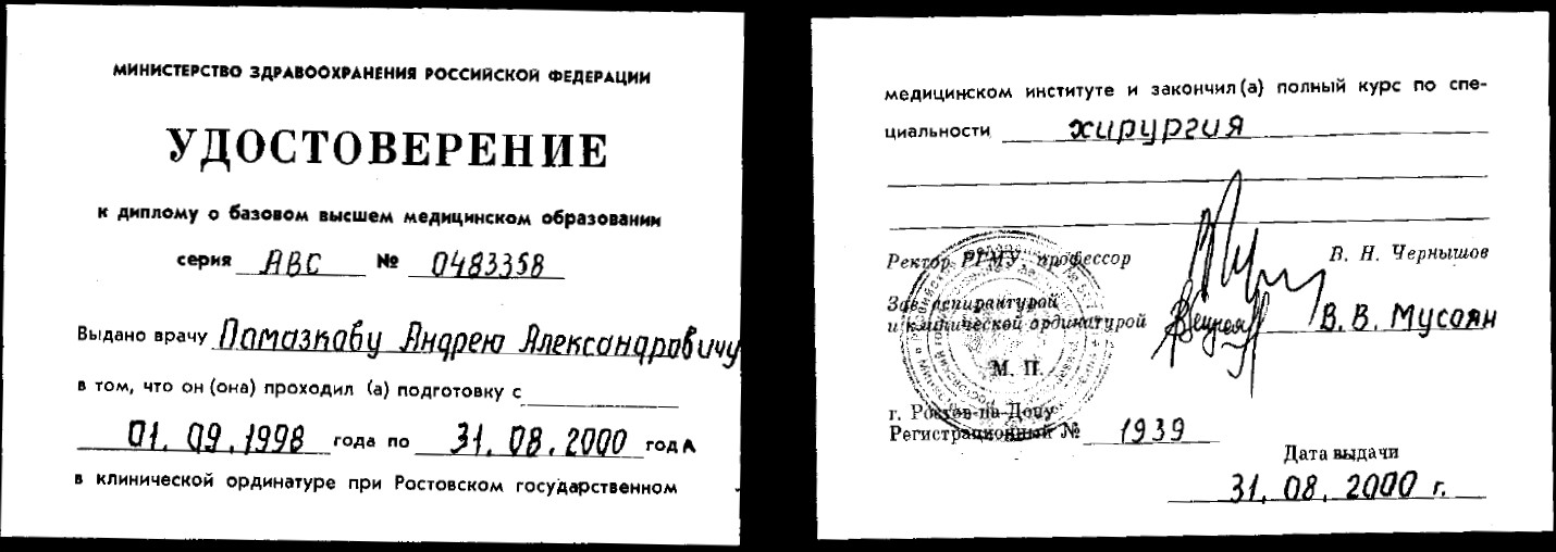2000 г. Удостоверение к диплому о базовом высшем медицинском образовании (ординатура) РГМУ в г. Ростов-на-Дону