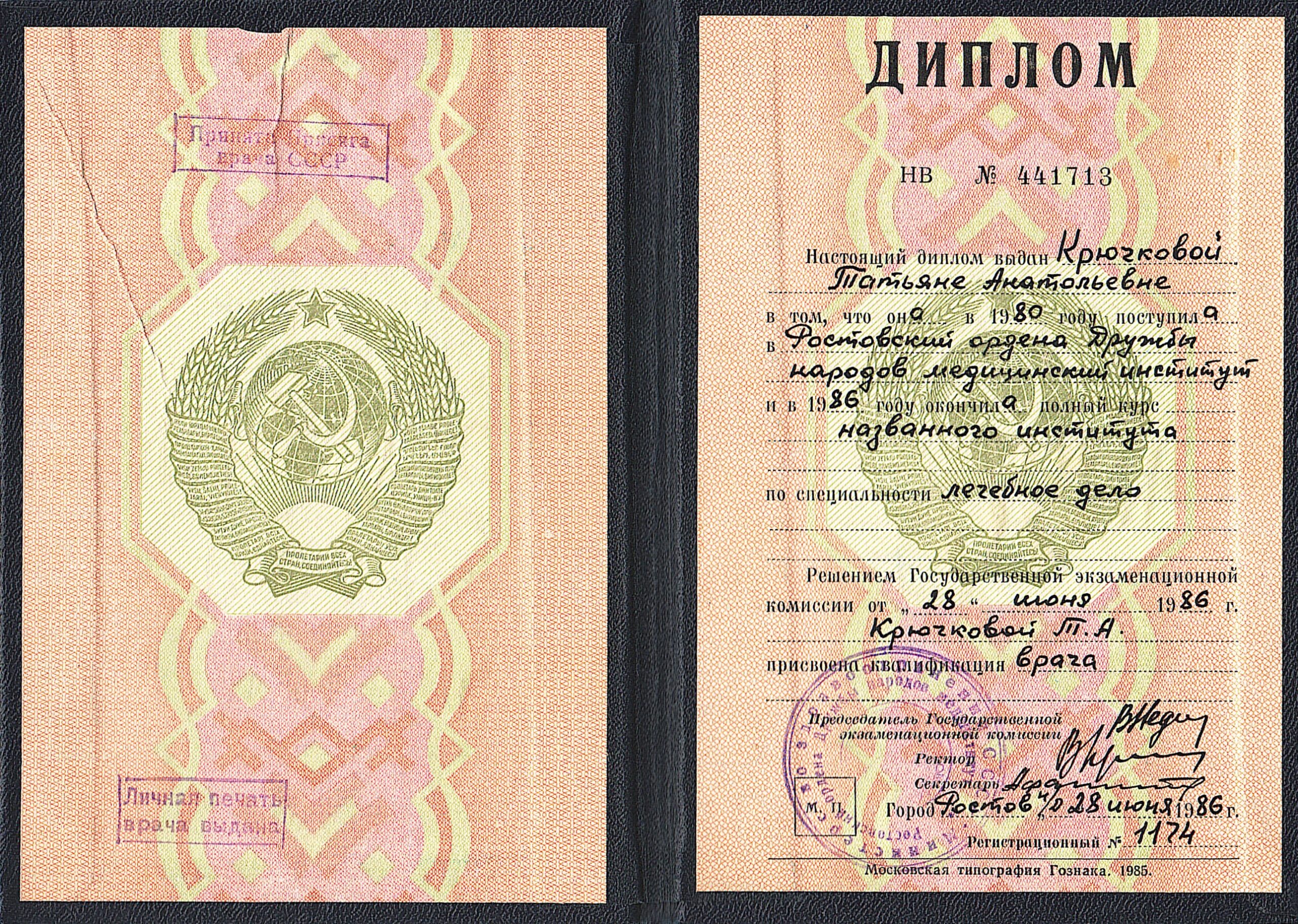1986 г. Диплом Ростовский ордена Дружбы народов медицинский институт