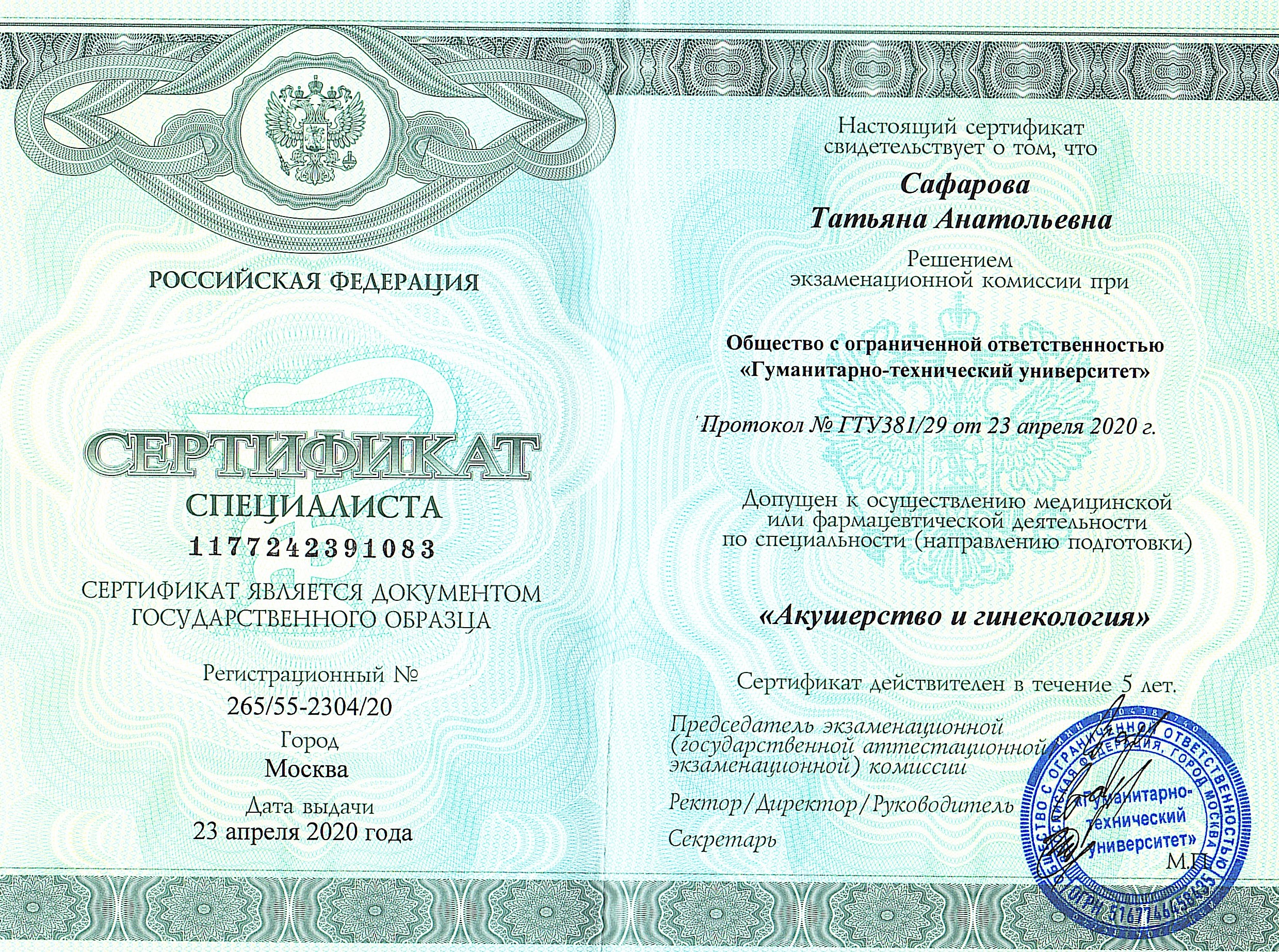 2020 г. Сертификат специалиста 23.04.2020г по 23.04.2025г ООО «Гуманитарно-технический университет»