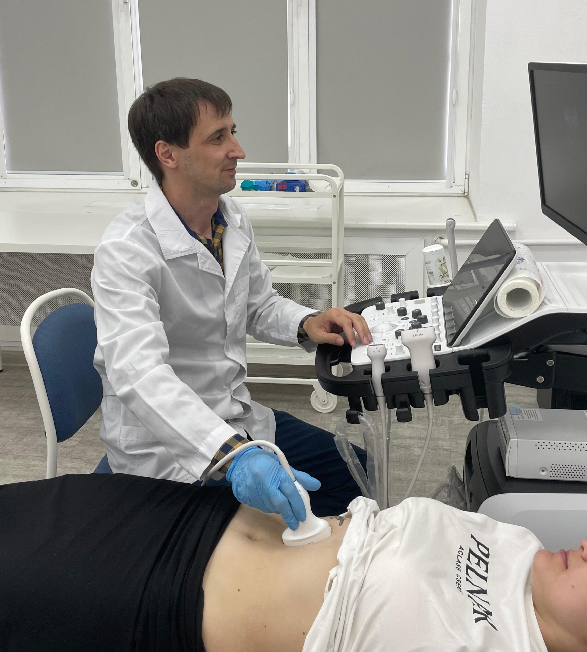 • Врач наносит на область живота специальный гель и с помощью датчика проводит исследование
